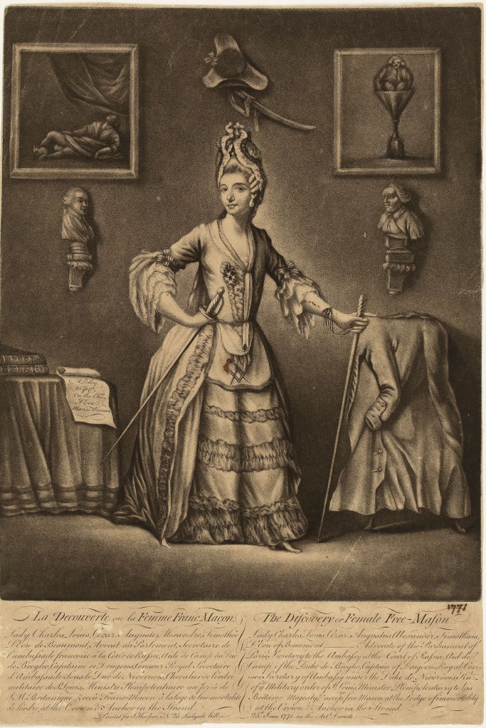 One of the most intriguing engravings of the 18th century shows an elegant lady holding a sword and staff, wearing a cross of the military order of Saint-Louis and, more bizarrely, wearing a Masonic apron. The engraving is entitled ‘La Découverte ou la Femme Franc-Maçon’ – roughly translated as ‘The Discovery of the Female French Mason’. Rites of Adoption were not uncommon in France, with women being admitted to quasi-Masonic Orders but what was most unusual was that the woman in the picture was actually a man. A cross-dressing author, diplomat, soldier and spy, the Chevalier d’Éon, became a legend in his own lifetime.