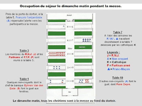 The grouping at the tables is done by linguistic affiliation, by affinity and by organization of resistance. Catholics tend to get closer to priests and in the evening chant collective prayers aloud. Believers are much more numerous and on Sunday mornings, they meet at the back of the dormitory for mass.